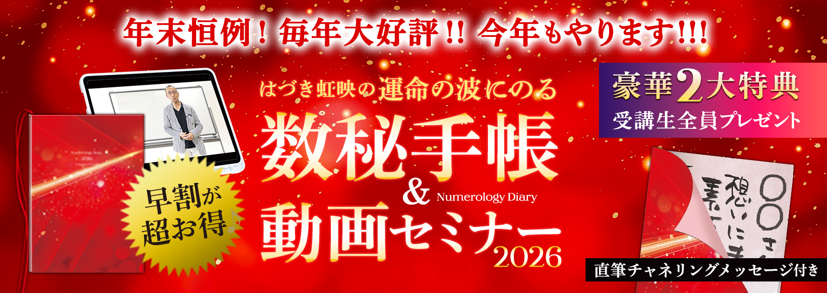 はづき式自己ヒーリングオンラインスクール YouTube Blog 新着情報 ライブセミナー 【11/3(月・祝)10:30~「名古屋講演会」】~2026年「1:発展・スタート」の年!運気の波を乗りこなすコツはスバリ!これだ!! ~好評につき満席となりました。 ライブセミナー 【10/26(日)13:00~「広島」講演会】~2026年「1:発展・スタート」の年!運気の波を乗りこなすコツはスバリ!これだ!! ~受付中 セミナー 『ゼロからマスターするはづき数秘術オンライン講座』受付中! 無料 週刊メールマガジン はづき虹映の『数秘術メッセージ』 はづき虹映が数秘の智慧を活用し運気の波を乗りこなし、 開運するためのコツをお届けします♪ 著書一覧 10/16 Thu. 8:充実の日 10/16 Thu. 8:充実の日 今週の魔法のワンポイント(1/1~1/1) マンスリーメッセージ 10月★1 : 発展の月 無料コンテンツ 究極生まれ日運命学 365日誕生日全書占い 誕生日占い 前世占い 生まれた日占い 恋に効く男と女の占い(9月末で配信終了)